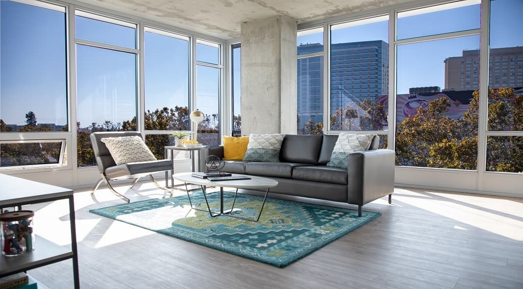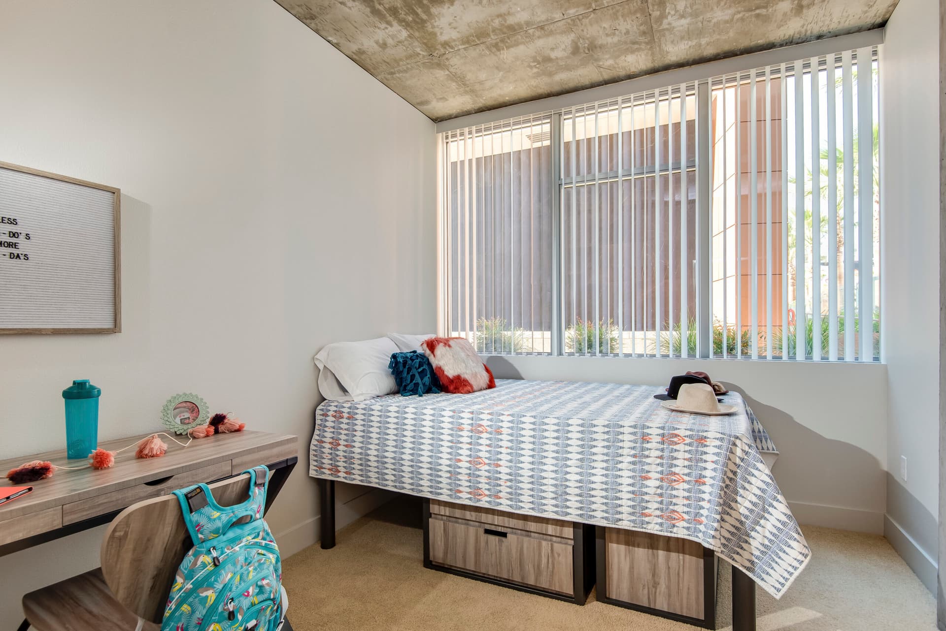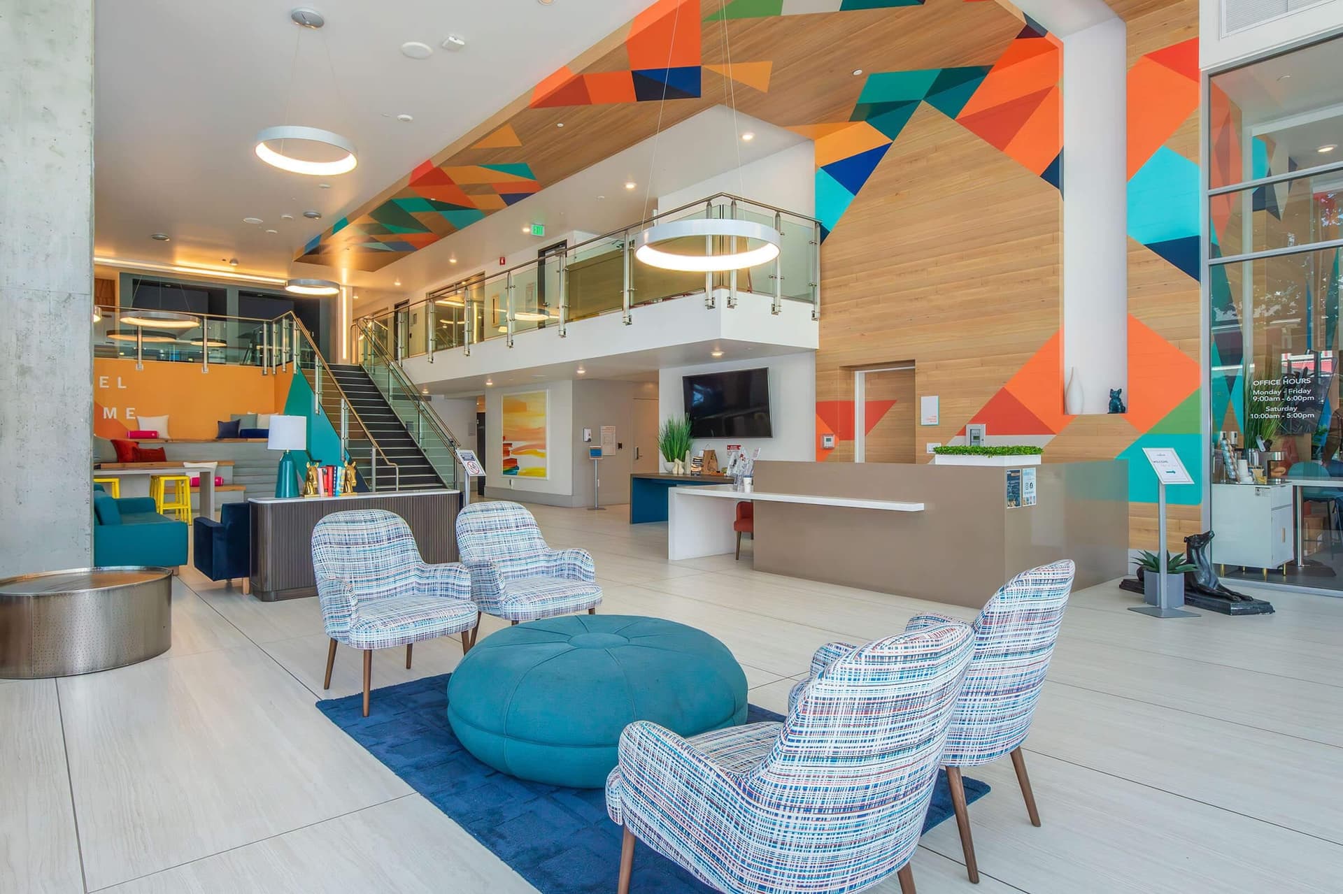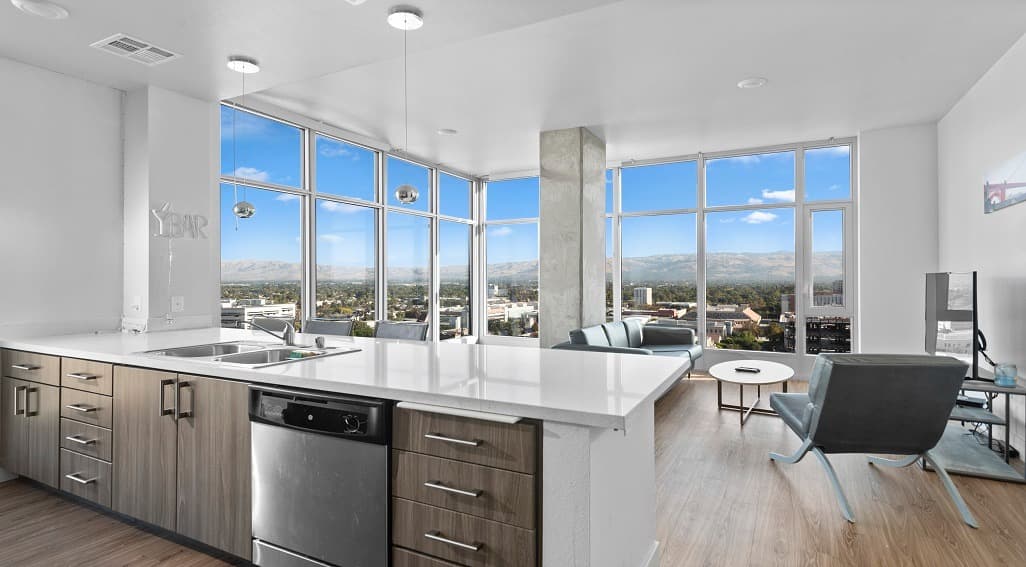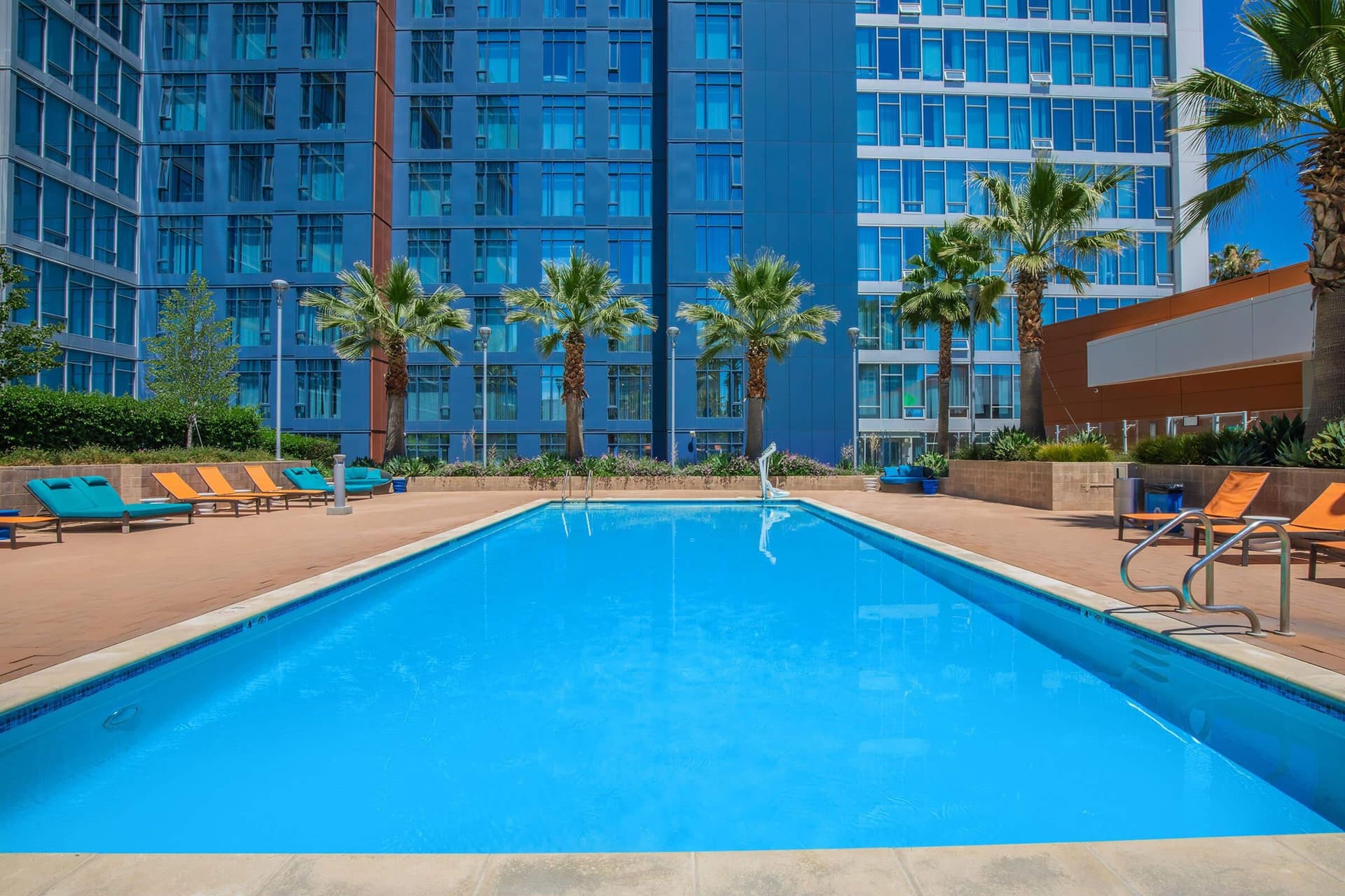 The Grad offers individual leases across a mix of studios through four-bedrooms, featuring floor-to-ceiling views of downtown San José, wood-style flooring, granite countertops with bar seating, modern fixtures, and stainless-steel appliances. A resort-style rooftop pool with Jumbotron, expansive fitness and yoga facilities, dedicated study rooms on every floor, computer lab, and building-wide high-speed Wi‑Fi create a best-in-class amenity package,
